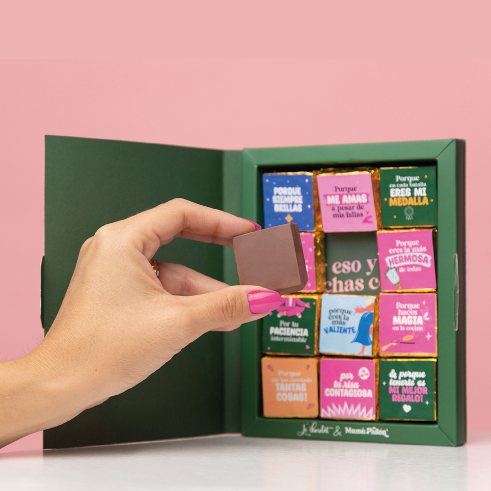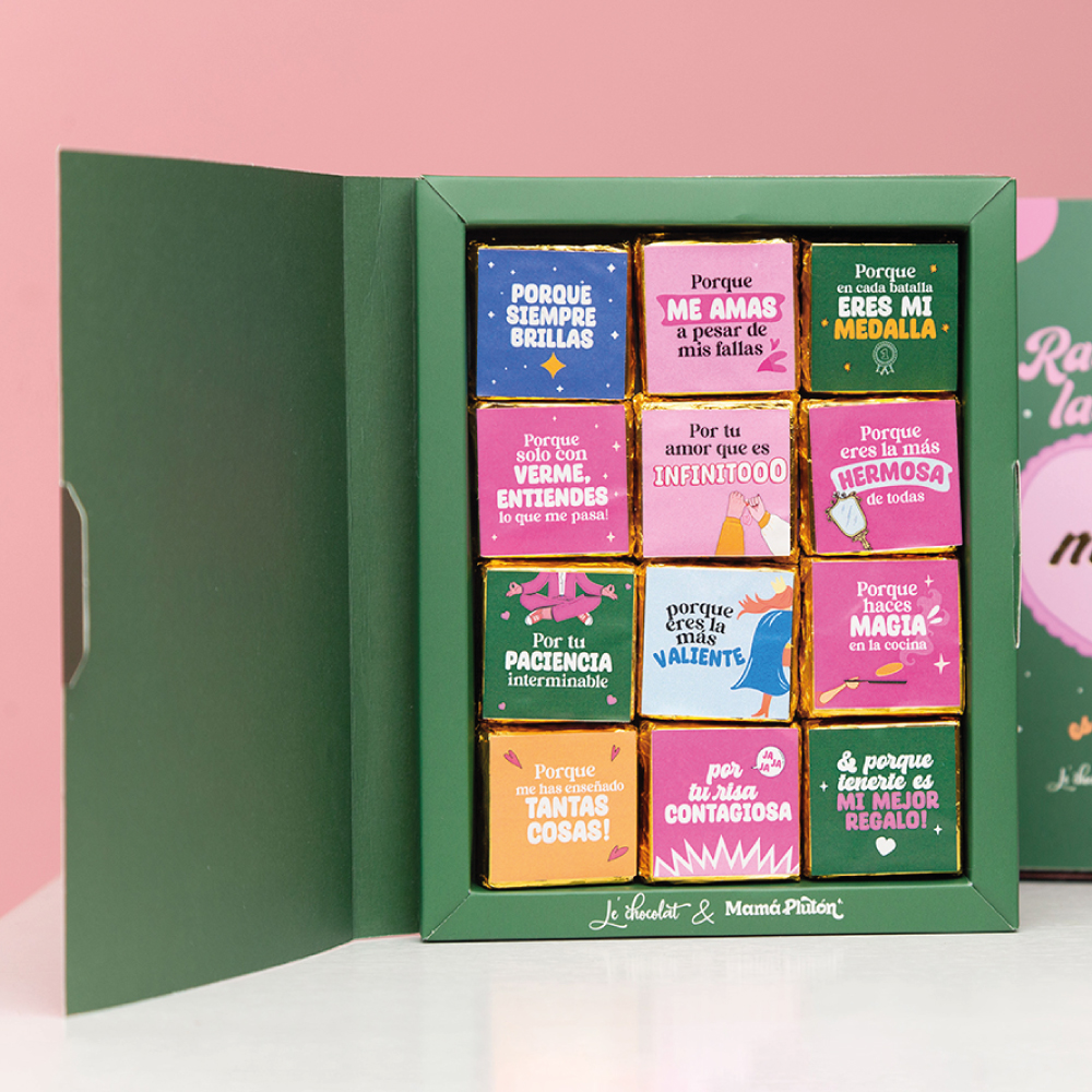 Abre esta caja de delicias y déjate llevar por el delicioso sabor de nuestros chocolates, mientras celebramos juntos a la número 1 en nuestras vidas: mamá. Con doce mensajes especiales que expresan gratitud, amor y admiración, cada chocolate es una dulce manera de honrar su incomparable grandeza.